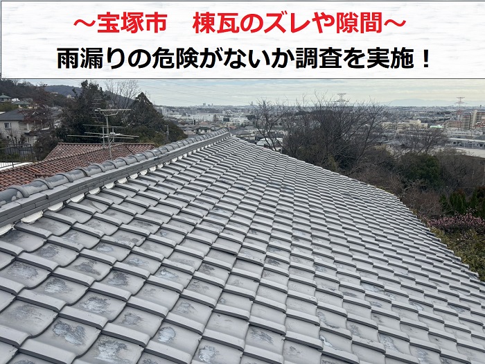 京都市左京区にお住まいのK様から、玄関屋根の庇が傾き、雨漏りの危険があるとのご依頼をいただきました。K様は、最近雨の日になると玄関付近に雨漏りが発生していることに気づき、不安を感じていたとのことです。街の屋根やさん京都南店は、K様のご自宅に現地調査を行い、屋根の状態を詳しく確認しました。 ...続きを読む2024/04/26 宝塚市 棟瓦にどんな修理が必要?ズレや隙間が発生すると雨漏り危険あり