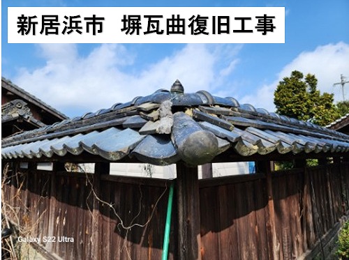 「去年の台風で、お隣様に瓦が飛んでしまい迷惑を掛けてしまいました。しかし自分で屋根を確かめたところ広い部分で壊れたとこは1箇所、あとは割れた部分が複数ある状態です。今年も強い台風が来たら心配なので診に来て対策を御願いしたいです。」 お問合せ御客様は台風シーズン前に去年の光景を回想されたのでしょう。焦った物言い ...続きを読む2024/04/27 新居浜市のご自宅の塀瓦破損。曲がり部分の復旧工事を実施し元通りにしました。