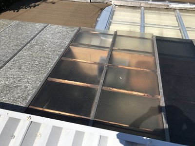 2024/04/8 三重県津市にて店舗の倉庫屋根波板ポリカにサンシェード取付作業