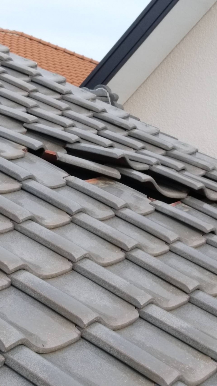 清水区七ツ新屋のお客様より、屋根材が剥がれているので修理をお願いしたい、とご連絡をいただきました。日々、風や雨に当たり、太陽光の熱で建材の収縮もあり、鋼板をとめてあるビスがだんだん緩んできます。 ...続きを読む2024/03/24 駿河区谷田 強風による屋根瓦ずれと庇屋根材の破損