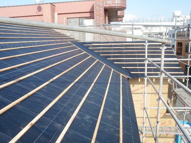 今日は木造2階建て住宅の屋根の防水工事を行っています。緑色のシートがアスファルトルーフィング。この上にガルバリウム鋼板屋根を施工します。以前は瓦が主流の時代もありましたが、重量が重い事で建物の耐震性能としては不利である事。また、台風に煽られて落下事故の心 ...続きを読む2024/03/24 静岡市葵区新富町の陸屋根の工事、ガルバリウム鋼板葺き