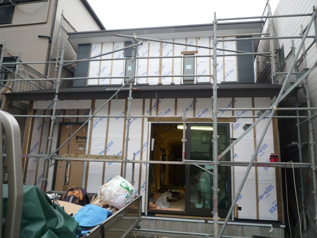 外壁を貼る前に・・・・防水紙の施工です。 通常はタイベック・ハウスラップを貼りますが (https://www.tyvek.co.jp/construction/product/housewrap/) 今回はタイベック・シルバーを選択しました! ...続きを読む2024/03/23 藤枝市駅前2丁目のH様邸現場 板間の防水コーキング工事をしています