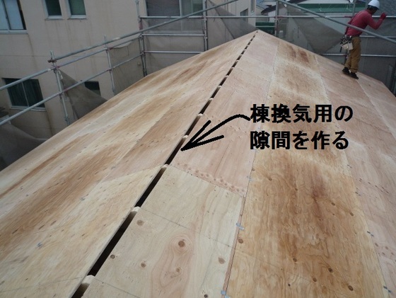 屋根下地の合板貼りをすすめています。一番うえの棟の部分んに隙間を空けます。 ここは最後に通気工法と言って 屋根や外壁の内側にこもった熱気をここから抜く工夫を施すためです。 ...続きを読む