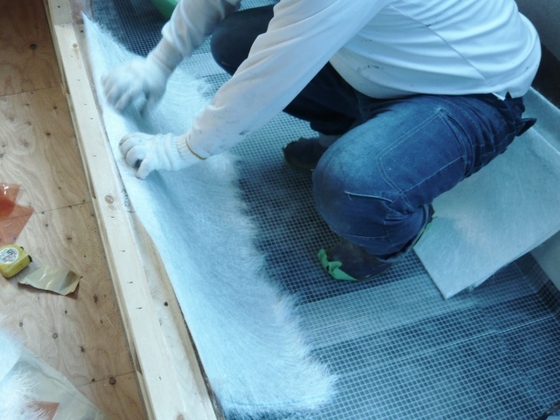 葵区瀬名で、ベランダのFRP防水工事の様子です。白いパフパフした布のようなものを貼っています。FRPとは、繊維強化プラスチックの略で名前そのままガラス繊維のようなプラスチックです。 ...続きを読む2024/03/23 伊豆の国市田京 E 様邸現場 外壁が貼り終わり、これから防水工事が始まります