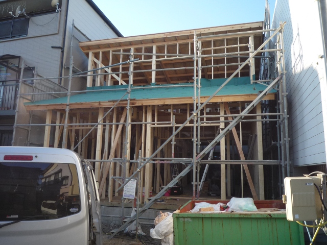 昨日屋根の防水工事(緑色のシート)は全て完了しましたので、これから屋根を葺きます。 今日は午後に2時間程 ザーーーッ!とにわか雨が降りましたけど合板は濡れなかったです。^^v ...続きを読む2024/03/23 藤枝市駅前2丁目のH様邸現場 外壁工事の開始です♪