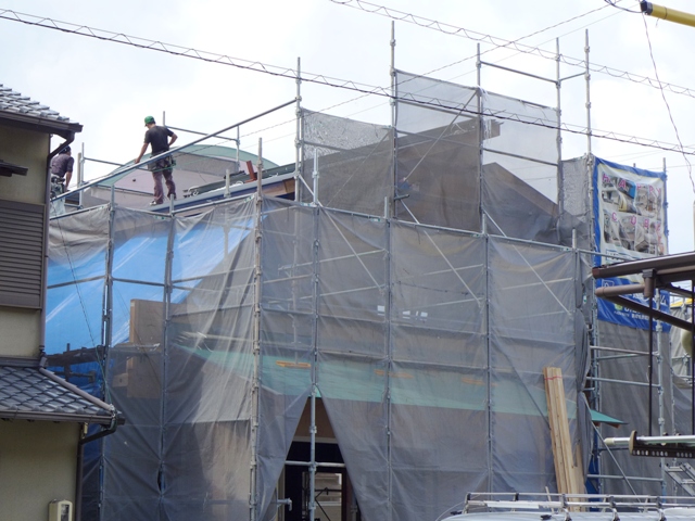 清水区長崎の現場です。骨組みが建った翌日には、屋根の下地合板の上に緑色の防水シートを貼りました。今日は屋根を葺いていきます。 屋根材 ...続きを読む2024/03/23 静岡市清水区高橋で外壁工事を行いました。