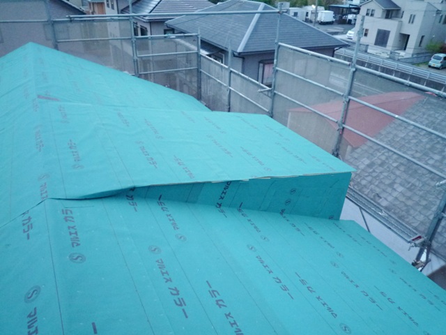 先日屋根の種類と色のご検討をしていただいていた静岡市葵区柳町の2階建て住宅の屋根の様子です。あまり赤い屋根にならないように焦げ茶色の瓦屋根を葺くことになりました。屋根は2階と、一部1階の玄関前ポーチの上の施工となりました。バルコニーがブルーシートで覆われ ...続きを読む2024/03/23 静岡市清水区押切で屋根工事とバルコニーの防水工事を行っています。