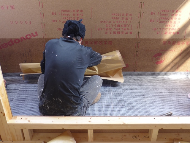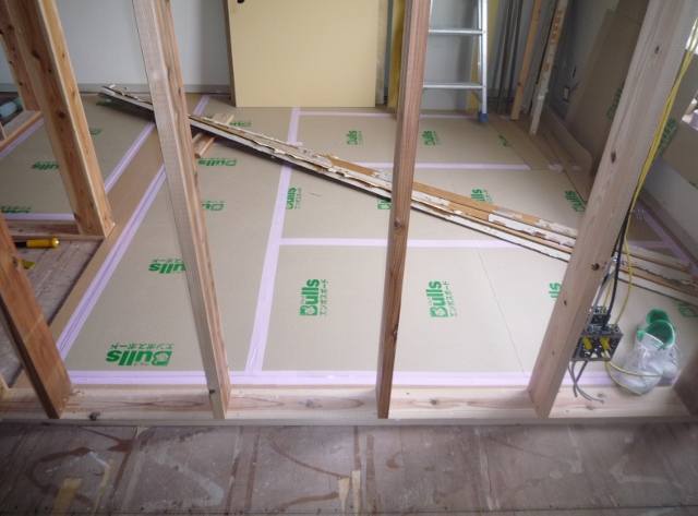 間仕切り用の柱(間柱)の位置が決まり部屋割が確定!すでにフローリングの施工も完了です。キズ防止の養生板が貼られてしまって・・・色がわかりませんね。 ...続きを読む2024/03/23 静岡市葵区音羽町S様邸現場 FRP防水の施工の様子
