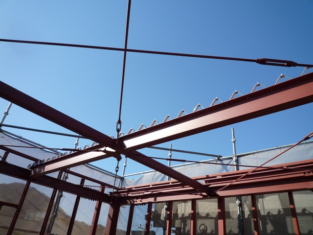 伊豆の国市田京で重量鉄骨造の3階建て住宅の屋根の施工を行っています。鉄骨の3階建ての場合、木造と違って構造体が太いので、建築基準法の高さ制限(今回の地域は10m)にギリギリとなります。ですからこの上に三角屋根を組むことが出来ない為、ほぼ平らに近い形状の屋 ...続きを読む2024/03/23 静岡市駿河区中田で上棟! 引き続き屋根工事に取り掛かりました。