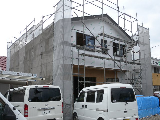 屋根はガルバリウム鋼板で仕上げました。足場伝いでココまで上がると・・・結構怖い(><)屋根全体を撮りたいけれど、これ以上身を後ろに反らしてカメラを構えるとマジヤバイ。私に万が一の事があれば・・・カミさんからしてみると「保険はおりるし、住宅ローンがぜ~~ん ...続きを読む2024/03/23 静岡市清水区草薙 京藤呉服店 新築現場 透湿防水シートを巻いています
