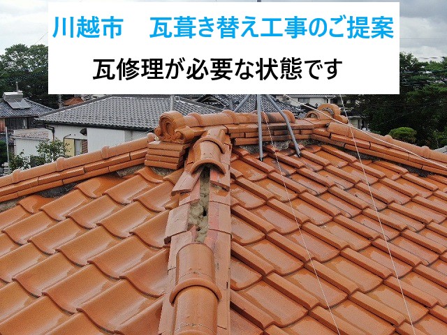 三郷市の皆さま、こんにちは(*^-^*)街の屋根やさん越谷店です! 本日のブログは飛び込みの業者に突然「棟板金が浮いていますよ」と指摘されたというお客さまからのご相談。屋根に登り調査してもらったけれど、提示された修理費用が高額だったため不審に思い、当店にご連絡をいただきました。 ...続きを読む2024/03/6 川越市で瓦葺き替え工事のご提案!漆喰劣化・瓦破損欠落と重度の劣化症状が⤵