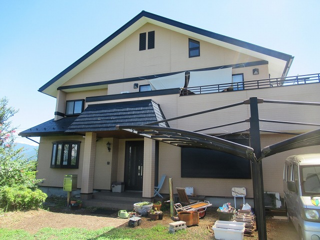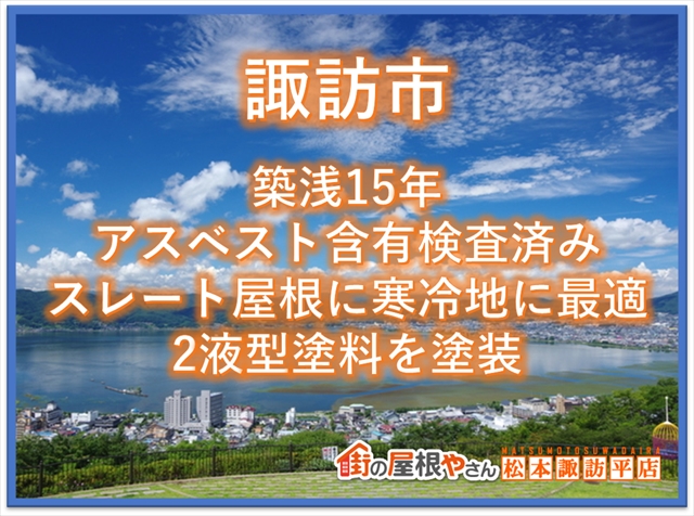 こんにちは、街の屋根屋さん堺店です。本日は藤井寺市にて住宅の離れとして使用しているプレハブ住宅の天井が変形しているため、点検して欲しいとのご依頼があり現地調査を行った様子をご紹介します。『離れ』とは同じ敷地内に建っている『母屋』とは別の付属的な建物の事を表します。当店では事務所等に使用しているプレハブや倉庫な ...続きを読む2024/02/29 諏訪市:築浅15年アスベスト含有検査済みスレート屋根に寒冷地に最適2液型塗料を塗装