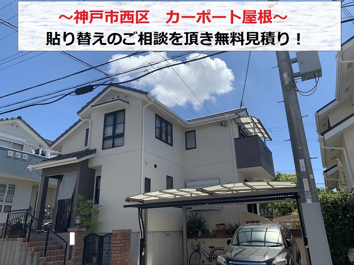 皆さんお疲れ様です!街の屋根やさん神戸西店です。今日は、姫路市の店舗付き住宅にお住まいの方より「台風7号の影響で瓦屋根から雨漏りしているので調査してほしい」とご相談を頂き、現地へお伺いした時の様子をご紹介して行きましょう(^_^)/お盆休みに関西へ直撃した台風7号ですが、そこまで大きな台風ではなかったものの広 ...続きを読む2024/02/29 神戸市西区 カーポート屋根の貼り替え相談!無料見積りを実施