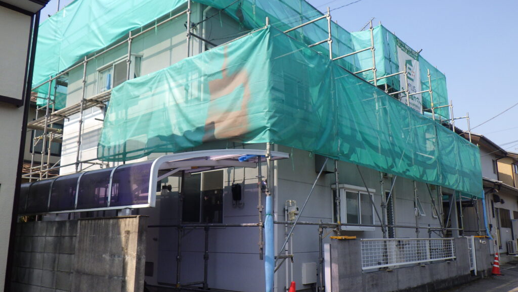 宇都宮市で屋根修繕と塗装工事が着工となりました。二階造りの住宅の全景となります。屋根塗装をする為、塗料が飛散しないようメッシュシートが覆われていて見えないですが、スレート屋根の塗装が始まります。 ...続きを読む2024/02/19 西宮市「屋根修理や外壁塗装、本日は雨戸の塗装について」