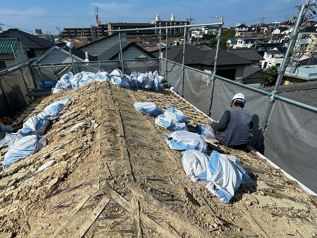 塩尻市で屋根の塗装を行いましたのでご紹介します。金属素材の片流れという一方に勾配が付いている屋根で、最近の新築の家で多く見られる屋根です。見栄えが良く、屋根裏やロフトがつけられるので収納や居住スペースが広く取られるというメリットがあるようです。欠点は屋根面積が広くなり、屋根からの熱で室内が暑く ...続きを読む2024/02/16 名古屋市南区で雨漏りした住宅の屋根葺き替え工事、足場設置後の瓦降ろし