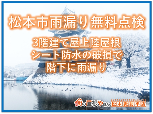 2024/02/16 松本市雨漏り無料点検:3階建て陸屋根の屋上:シート防水の破損で階下に雨漏り