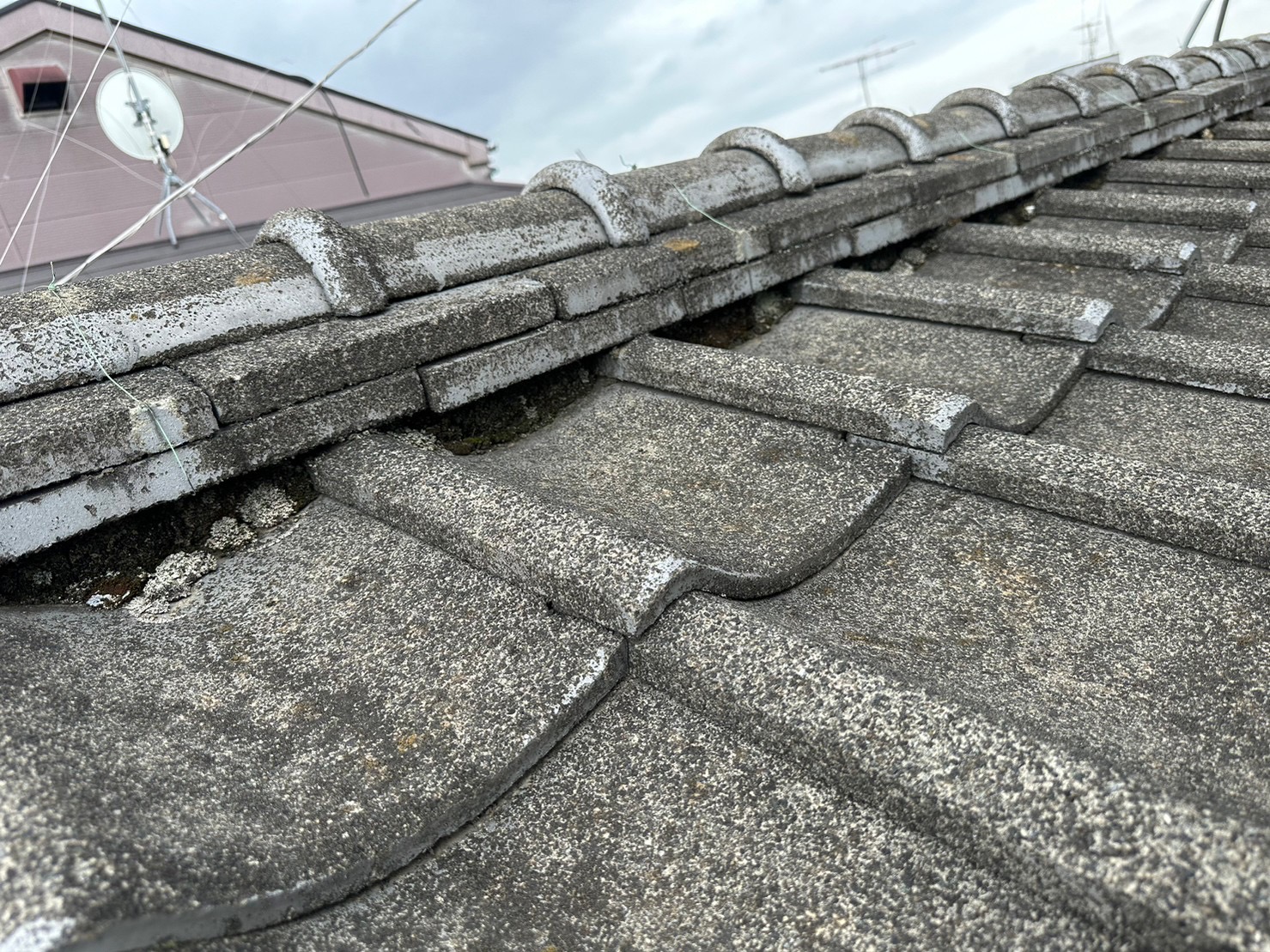 こんにちは、街の屋根屋さん堺店です。本日は堺市南区にてベランダのポリカーボネート製屋根が外れかかっているので点検して欲しいとのご相談があり、現地調査にお伺いした様子をご紹介します。冬から春にかけて吹き抜ける突風によって、屋根が煽られて外れかかっているものと見られました。台風以外の突発的な強風などでも火災保険が ...続きを読む2024/02/2 川越市にお住まいのお客様から『近くで工事している業者に瓦がズレている』と言われ不安に思い問い合わせ。
