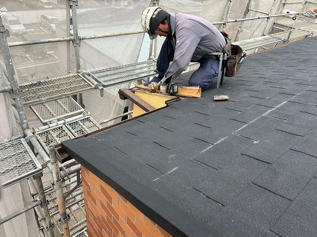 こんにちは!街の屋根やさん、山梨店です!今回も引き続き、甲府市の屋根カバー工事で防水シートを設置した様子をご紹介します!同時に、前回のブログでご紹介したケラバの部分に関しては、木材と板金の取付けの段階まで写真で ...続きを読む2024/02/2 周南市で屋根修理、隅棟の棟瓦取り直し工事と谷板金(谷樋)の交換