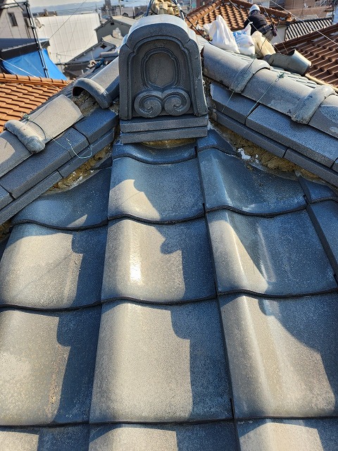 施工前写真になります。鬼瓦周りの写真ですが、被さっている5寸丸瓦がズレていたり漆喰がはがれているのがわかると思います。和瓦の棟がズレている主な原因は、経年劣化により中の土が風化し重みに耐えきれなくなり段々とズレが生じてくる事と、地震や台風などの災害によるものが多いです。 ...続きを読む2024/01/18 堺市中区にて台風で飛散したベランダ屋根の平板パネルを取り付け工事|火災保険で自己負担なく修理できました