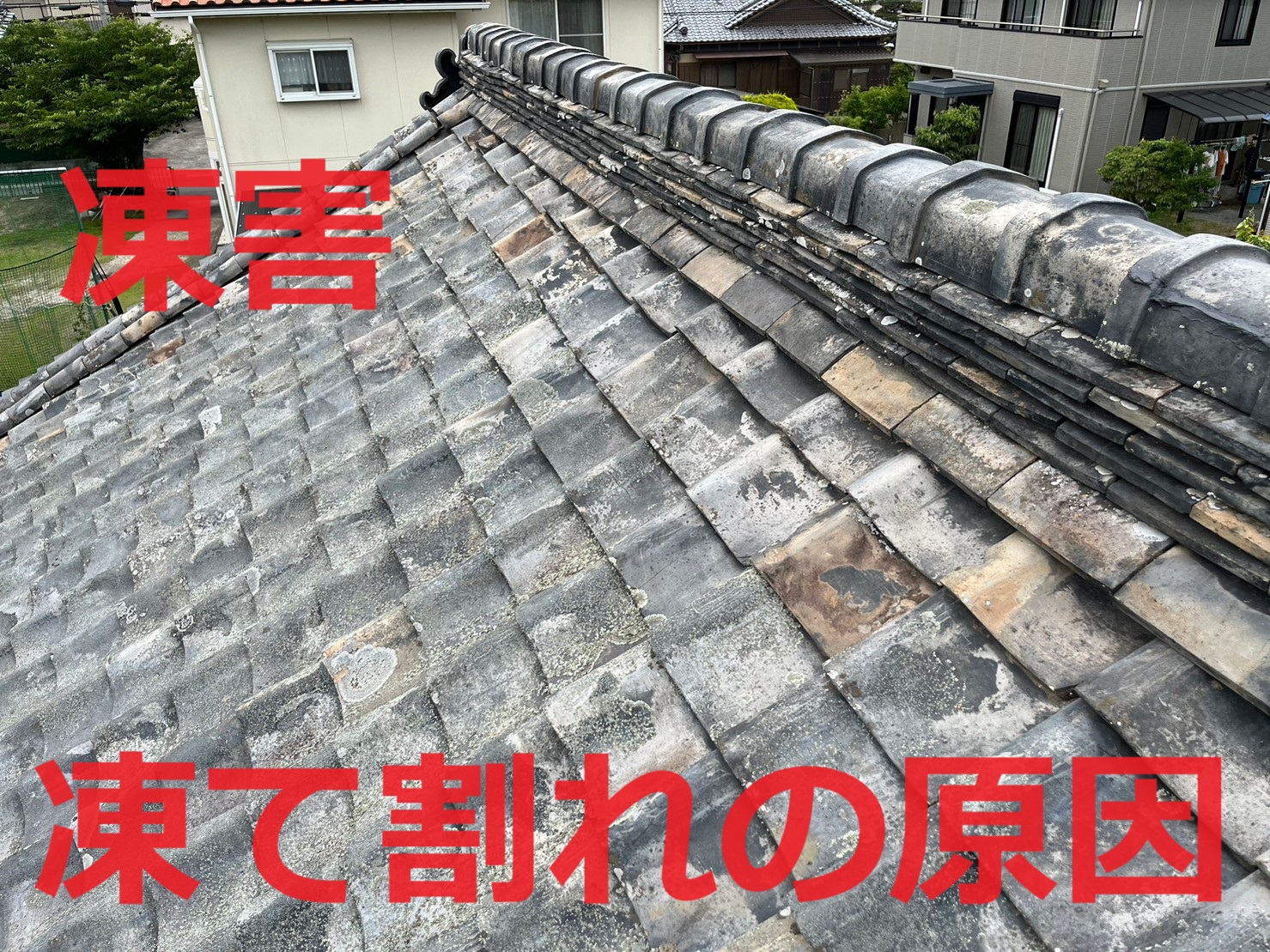 今回は日進市にて棟から雑草が生えてたので、瓦の積み直し工事を実施した事例を紹介していきます。棟から雑草が生えてくる現象は、棟の内部へと雨が浸水している可能性が高い症状です。漆喰だけ直しても根本的な問題解決に繋がらないため、意味が有りません。屋根内部への水分侵入を防ぐため、一度棟を解体して積み直しを行いました。 ...続きを読む2023/12/18 桑名市の方へ冬の寒さが瓦に引き起こす凍害の解説と原因とは?
