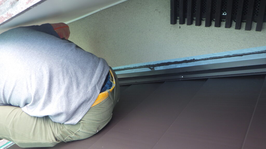 宇都宮市で軒天とスレート屋根のカバー工事が完工しました。 壁水切りのシーリング作業中です。 棟違い屋根の棟板金で、外壁と壁水切りの両方にマスキングテープで養生をしてから、横暖ルーフ専用シーリング材を塗布してヘラで均し、乾燥前に養生を剥がして終了です。 ...続きを読む