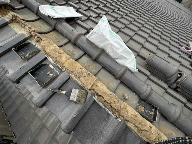 2023/12/11  熊本市東区で瓦屋根の漆喰が剥がれて中の土が見えている!漆喰詰め直し工事をご提案しました