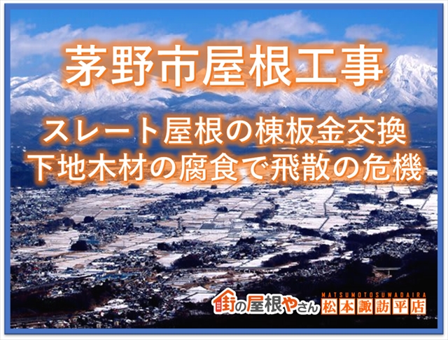 今回は、岐阜市でスレート屋根の塗装工事をご紹介します。まずは、屋根を高圧洗浄します。高圧洗浄後は約1~2日空けて乾燥させる必要があります。乾燥させて乾いた状態にしてから塗装を行わなければ後から塗膜の膨れなどの原因になる場合があります。高圧洗浄だけで全ての汚れなどが取れるわけではありません。ケレ ...続きを読む2023/12/2 茅野市屋根工事|スレート屋根の棟板金交換|下地木材の腐食で飛散の危機