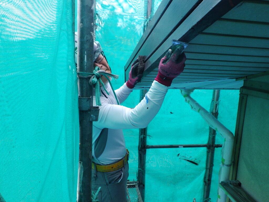 矢板市でザウルスEXを使いの軒天の下塗り塗装をしました。 金属部のケレン作業中です。 金属製の軒天の錆止め塗装をしていきますが、破風板金や外壁の目地カバーなども金属製の為、ケレンして浮いた塗膜や錆を落としていきます。 またケレン作業で塗装面に小さな傷を付ける事で、塗料が傷に入り込み密着性の向上 ...続きを読む2023/11/22 須賀川市にて天井に雨染みが発生した原因を特定するため散水試験を実施