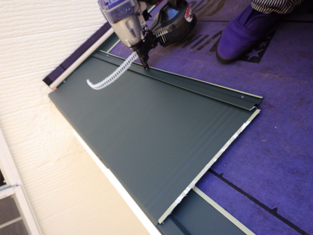 那須町で横暖ルーフSを使い屋根カバー工事をしました。 下屋根の横暖ルーフの貼り始まりです。 軒先に取り付けた水切りスターターの溝に、横暖ルーフの爪を引っ掛けて、1枚目のルーフを貼り付けていきます。 ルーフを固定するのは釘打ち機で、鋼板用の45ミリの釘で300ミリ間隔で固定しました。 ...続きを読む2023/10/24 美濃市で、笠木が原因の雨漏り修理工事