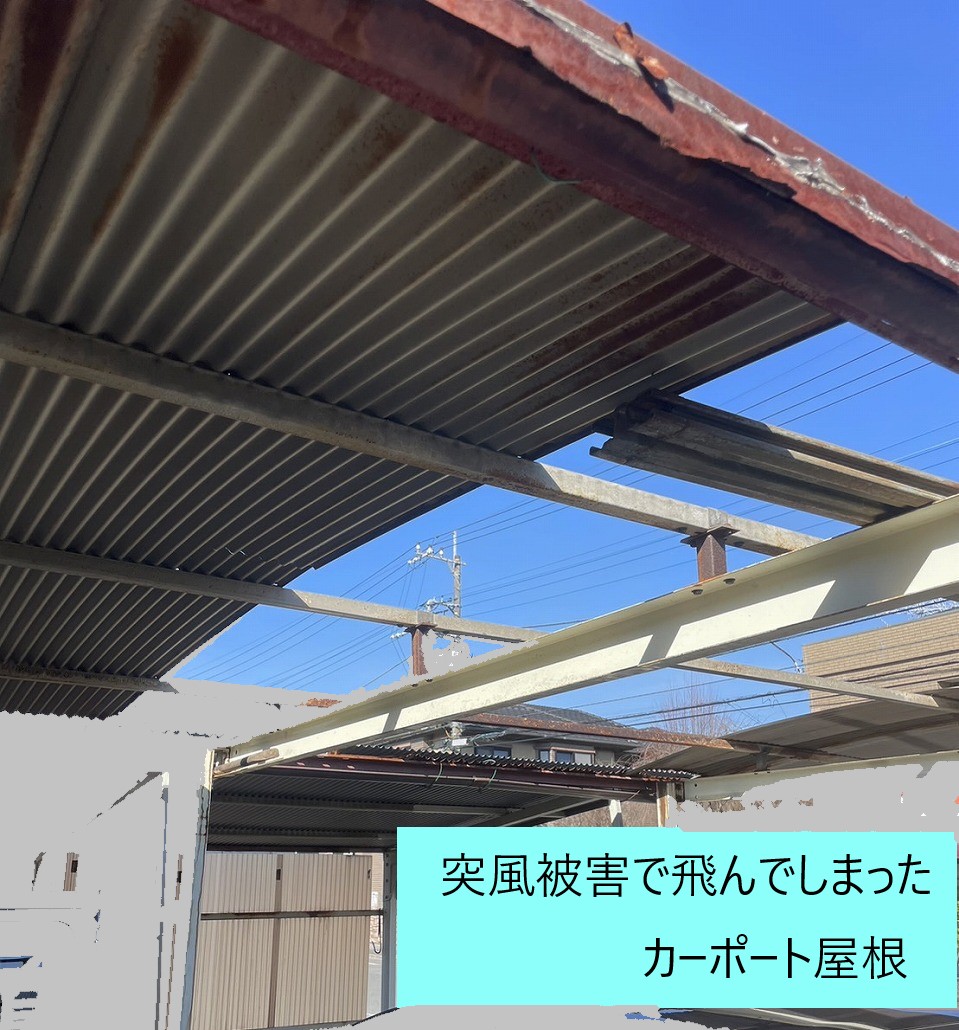 皆さんこんにちは。『街の屋根やさんいわき店』です。今回は南相馬市にお住まいのお客様よりご依頼を頂き補修工事を行ってきました。依頼内容ですが、「屋根の一部から雨漏りしている状態なので直してほしい」とのことでした。現場調査を行い補修工事を行わせて頂きました。関連記事 *雨漏り修理・雨漏り改修工事は ...続きを読む2023/10/24 三郷市で突風に襲われカーポートの屋根(板金・波トタン)が捲れ飛んでしまったとご連絡を頂きました!