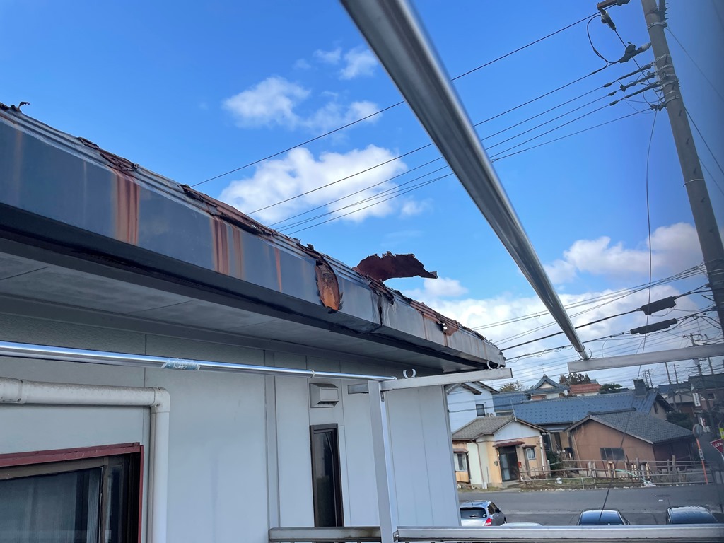 新潟市中央区にお住まいの方より、先日の強風によって棟板金が飛散したので見て欲しいとお問い合わせを頂きました。早速屋根上の棟板金を確認するために現地調査を行いました。街の屋根やさん新潟店では現地調査・見積は無料で行っております。街の屋根やさんの無料点検でお住まい全体の不安も解消!までお問い合わせください! ...続きを読む2023/10/21 新潟市江南区にて強風によって大屋根・下屋が一部破損したとお問い合わせを頂きました