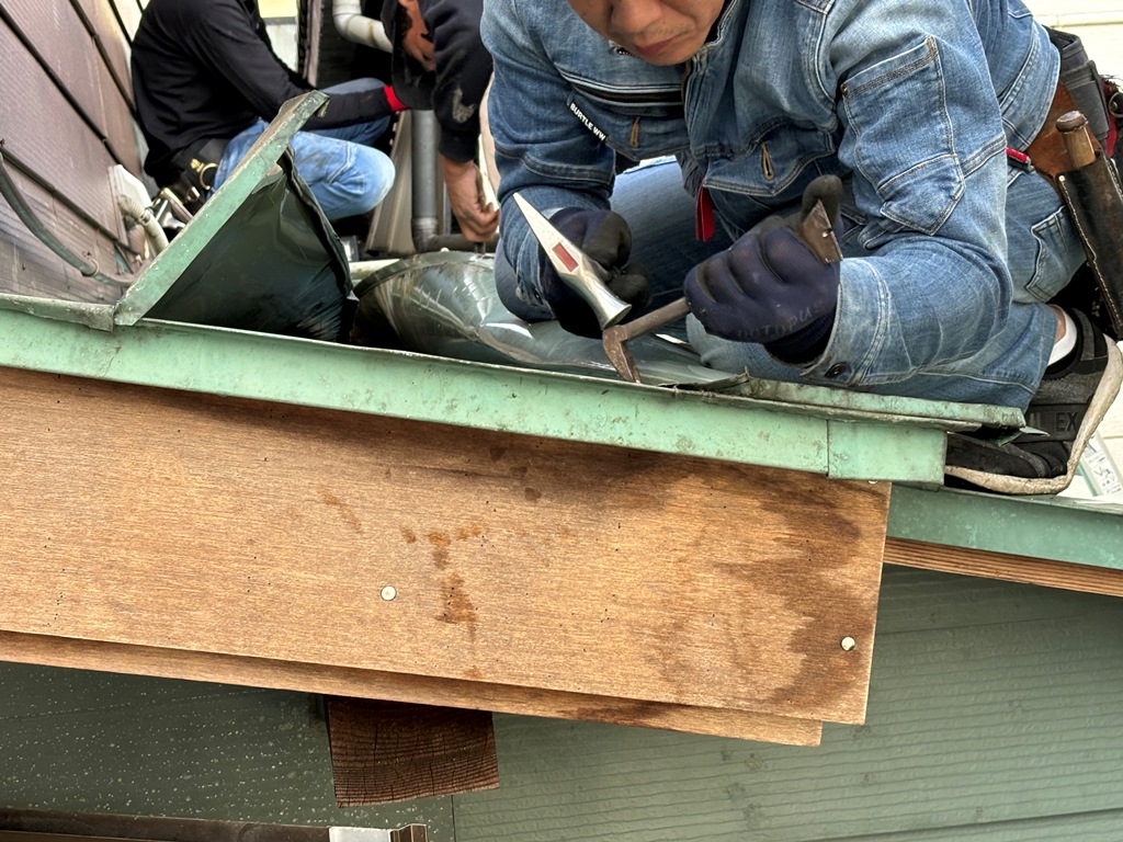 新潟市秋葉区にある社屋のトイレの天井が雨漏れしていたため、屋根の葺き替え工事を行うことになりました。このトイレは数十年前に増築をして数年前から雨漏れはしていたそうですが、段々と雨の漏る量が増えてきたこともあり、そろそろ修繕しようと思われたそうです。ただ修繕工事を行う前までに数日間空きますので応急処置としてコー ...続きを読む2023/10/21 新潟市秋葉区にて雨樋が外れたので見て欲しいとお問い合わせを頂きました