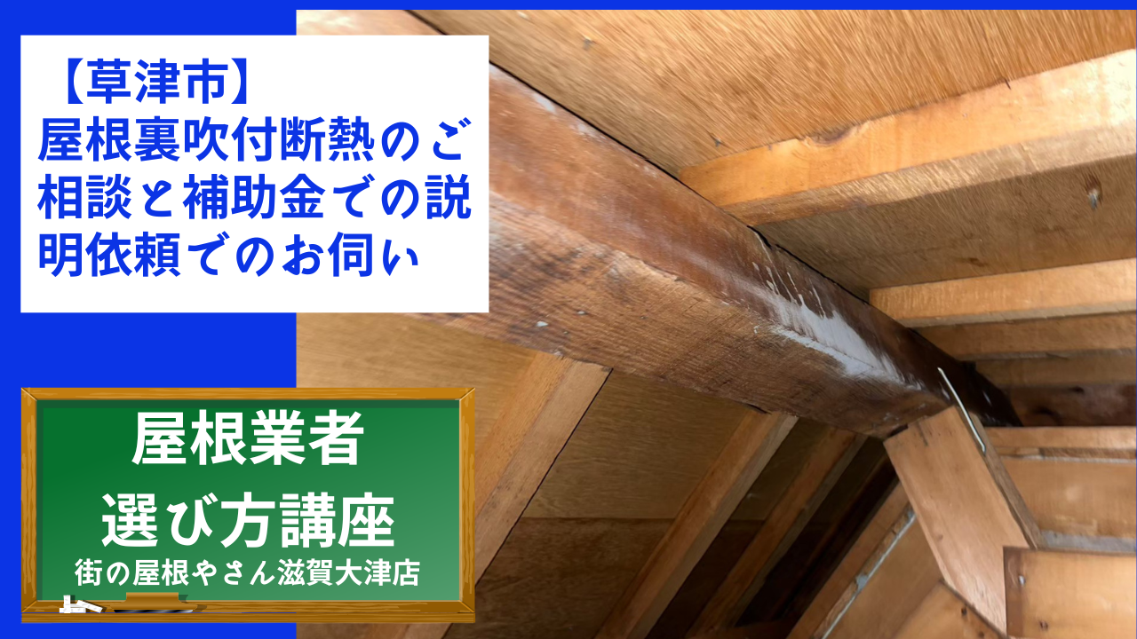 こんにちは。街の屋根やさん名古屋南店です。 前回のブログでは、名古屋市南区の住宅において、パミール仕様の屋根で著しい劣化を確認した現場調査の内容をお伝えいたしました。 今回は、前回の現場調査の続きとなる外壁の劣化状況を確認した調査内容についてご紹介したいと思います。▼前回までのブログ・名古屋市南区でパミール屋 ...続きを読む2023/10/3 【草津市】屋根裏吹付断熱のご相談と補助金での説明依頼でのお伺い