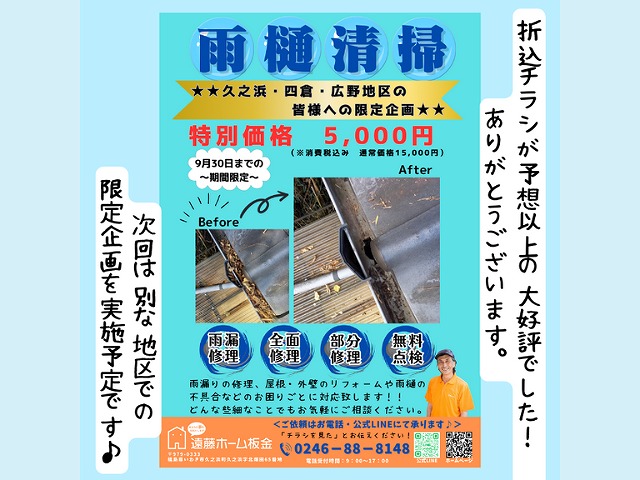 豊川市国府町にて平板瓦の棟瓦釘浮きを調査しました。お客様自身がベランダから脚立で確認したところ、釘浮きが多数見られ点検・修理をして欲しいということで伺いました。以前台風で棟瓦が飛んだことがあり、それ以来たびたびご主人がベランダから屋根の様子を確認しているとの事でした。あまり普段意識の行かない瓦屋根に関心を持っ ...続きを読む2023/09/29 いわき市四倉・久之浜・広野限定で行った特別価格での雨樋清掃。沢山のご依頼を頂きました
