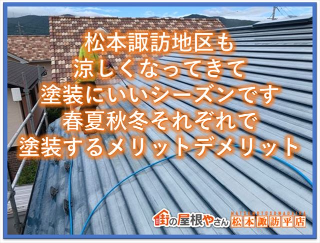 岐阜市で「瓦屋根の無料点検」に伺いました。瓦屋根にも様々ありますが、今回点検を行う瓦屋根は陶器瓦です。 2階建ての住宅で築35年のお家になります。これまで瓦屋根を修理したことは無かったようですが、屋根からの雨漏りや地震が不安ということで点検のご依頼をいただきました。 ...続きを読む2023/09/17 松本諏訪地区も涼しくなってきて塗装にいいシーズンです春夏秋冬其々で塗装するメリットデメリット