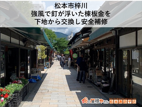 こんにちは!秋も深まり、そろそろおうちの冬支度を意識し始める時期でしょうか? さて今回は、三島市谷田地区にある古民家の屋根修理をご依頼いただきました。お客様から「雨漏りはしていないけど、屋根の状態が気になる」とご相談があり、現地調査をさせていただいたところ、“捨て谷”と呼ばれる部分に不 ...続きを読む2025/10/21 松本市梓川|強風で釘が浮いた棟板金を下地から交換し安全補修:ワンデーリフォーム