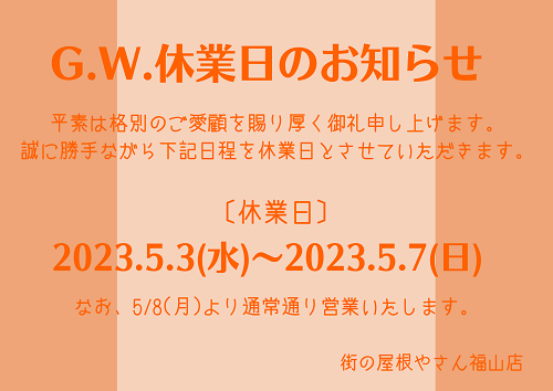 皆さまこんにちは!街の屋根やさん福山店です。今回は福山市で行いました『車庫の屋根調査』の様子を紹介いたします。街の屋根やさん福山店では、車庫やカーポート、ベランダの波板に関する工事のご依頼を多数いただきます。たくさんの現場を見てきていますので、お客様それぞれの状況や環境等によるご要望にしっかりとお応えできます ...続きを読む2023/06/16 ゴールデンウィーク休業日のお知らせ/街の屋根やさん福山店