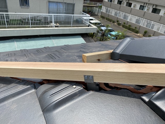 ほとんどの地瓦の伏せが終わり最後に棟の瓦を施工していきます。 地瓦を並べる前に写真のような強力棟金具を棟木のビスで固定していました。その金具に45×45ノ垂木を這わせてそれもビスで固定していきました。この金具で棟の瓦を地震によるズレを防止することができます。以前の大阪の地震前にこの ...続きを読む2023/06/17 枚方市 棟瓦からの雨漏り?!7寸丸瓦葺き替え工事です。