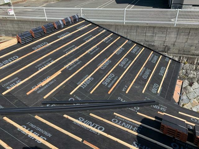 今日は屋根の防水に欠かせないルーフィングを、塩尻市広丘と安曇野市豊科で使ったものを比較しながらご紹介します。 屋根の下地の構造は一番下に垂木と言われる角材が屋根の一番頂上の棟(むね)から軒先(のきさき)に向かって取りけられています。垂木の上に野地板(のじいた)というベニヤが敷き詰められ、その上 ...続きを読む2023/06/17 摂津市 日本瓦から陶器瓦の平板瓦に葺き替え工事をしました。その3