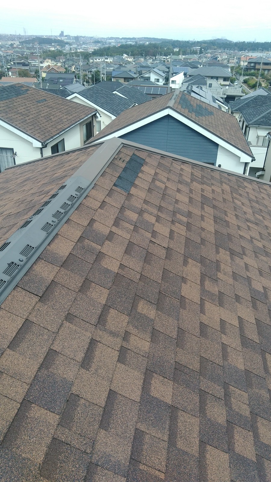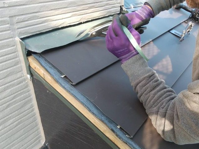 那須町でオークリッジスーパーを使い屋根カバー工事をしました。 ケラバ包み板金を加工して取り付けました。 大棟のケラバ包み板金の納は、外側を切断せずに捨て谷部分だけ雨仕舞を考え加工して、スクリュー釘で固定しました ...続きを読む2023/06/10 那須町のアスファルトシングル重ね葺き工事で板金を取り付けました