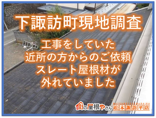 皆さんこんにちは!伊那支店長の平井です。今回のブログは木曽郡開田にて行ったトタン屋根の塗装工事のご紹介です。前回のブログまででトタン屋根の洗浄作業まで完了し、今回より塗装工事が始まります。今回使う塗料は、アステックペイントの「シャネツトップワン」と言う塗料になります。屋根の状態が良い(サビが無 ...続きを読む2023/06/10 下諏訪町現地調査|工事をしていた近所の方からのご依頼|スレートの屋根材が外れていました