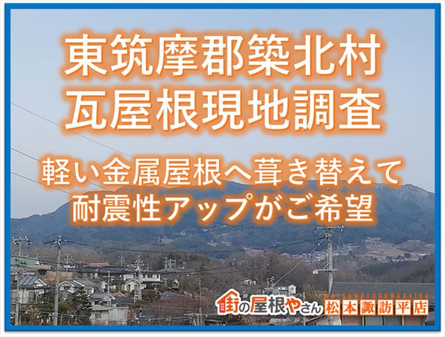 松本市のお客様から屋根塗装のお問い合わせがあり現地調査に伺いました。屋根材はガルバリウム製の金属屋根です。屋根面の状況は塗膜の色あせが見られ、塗膜の防水性はほとんどない状態、塗装する時期になっています。それ以上に気になったのが棟板金を止める釘が浮いていたこと。勾配の方向が違う屋根がぶつかるとこ ...続きを読む2023/06/11 東筑摩郡築北村瓦屋根現地調査|軽い金属屋根に葺き替えて耐震性アップがご希望