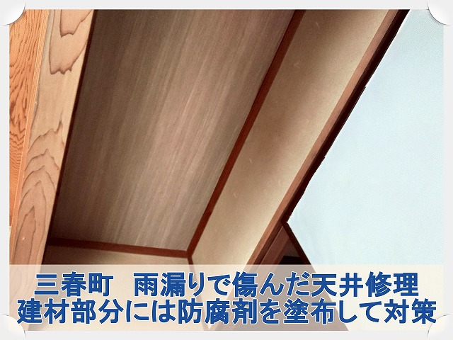 2025/10/31 三春町にて雨漏りにより傷んだ天井のリフォーム。建材には防腐剤を塗布して腐食防止