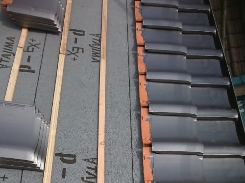 福山市にお住まいのお客様よりご依頼いただいた瓦屋根葺き替え工事をおこなっています。本日の屋根葺き替え工事では、瓦屋根の平部を施工しています。 前日までにおこなった屋根の下地補修、ルーフィングの下葺きと設置した桟木の上に瓦をとめていきます。▼前日までの工事の様 ...続きを読む2023/05/23 福山市にて色あせと穴あきのある塩ビ波板のカーポート屋根修理のご相談