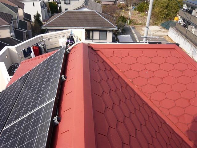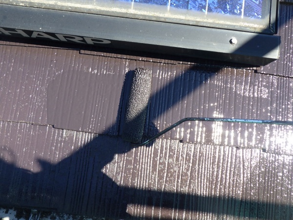 宇都宮市でスーパーシリコンルーフを使い屋根の上塗りをしました。 昨日中塗りまで進んでいたスレート屋根の上塗り塗装中です。 板金との取り合いや太陽光パネルの下など、ローラーではきれいに塗装できない部分に刷毛で塗料 ...続きを読む2023/05/22 宇都宮市でスレート屋根の下塗りと板金部塗装をしました。