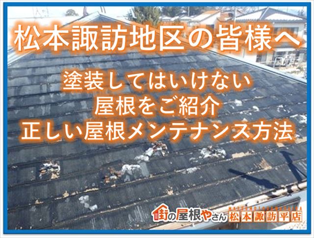 いつも街の屋根やさん松本諏訪平店のブログをご覧いただきありがとうございます。屋根工事、外壁工事をご検討されている皆様に参考になる情報をご提供してまいりますので、今後ともよろしくお願いいたします。 今回は塩尻市大門で行うサイディングのカバー工事の前の、付帯塗装の様子をご紹介します。雨樋や破 ...続きを読む2023/05/21 松本諏訪地区の皆様|塗装してはいけない屋根をご紹介|正しい屋根のメンテナンス方法