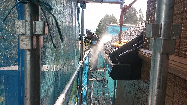 屋根 高圧洗浄 橿原市で屋根の塗り替えをしてきた施工事例を紹介します。写真は、屋根の高圧洗浄をしている様子です。ノズルは回転式の水流で洗えて ...続きを読む