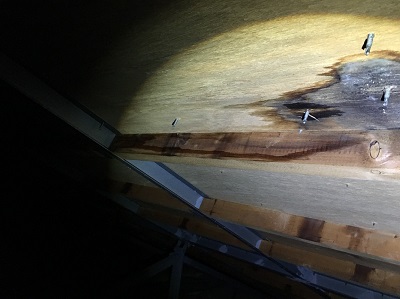 富田林市にて雨漏り調査を行いました築100年以上経っている瓦屋根のお住まいで、雨漏りが起こっているとのことです。屋根は現在雨漏り箇所の真上にブルーシートで養生している状態でした。この先長く住む予定はないので葺き替え工事のような大掛かりな工事をする予定はなく、部分補修工事で対応してほしいとのご依 ...続きを読む2023/05/19 稲沢市で、雨漏れが発生しているお家の定期点検の様子 天井裏に発生している湿った跡や黒ずみ、腐植の発生