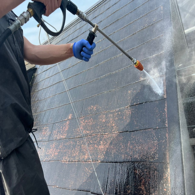 屋根 高圧洗浄 橿原市で屋根の塗り替えをしてきた施工事例を紹介します。写真は、屋根の高圧洗浄をしている様子です。ノズルは回転式の水流で洗えて ...続きを読む2023/05/18 福山市で混合している屋根の波板張り替え工事でポリカ波板を使用