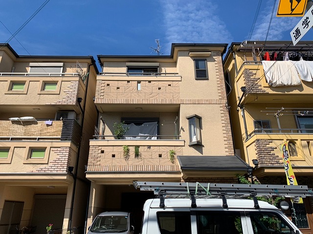 こんにちは、街の屋根やさん熊本店です。熊本市東区にて、春の嵐で1階テラスと2階ベランダの波板が飛散し『屋根全体の状態や雨漏りしないか不安で、屋根全体の点検も一緒にしてほしい』とご連絡がありました。冬から春の季 ...続きを読む2023/03/7 大阪市 3階建てマンションで屋根修理!剥がれたベランダ天井を板金でカバー